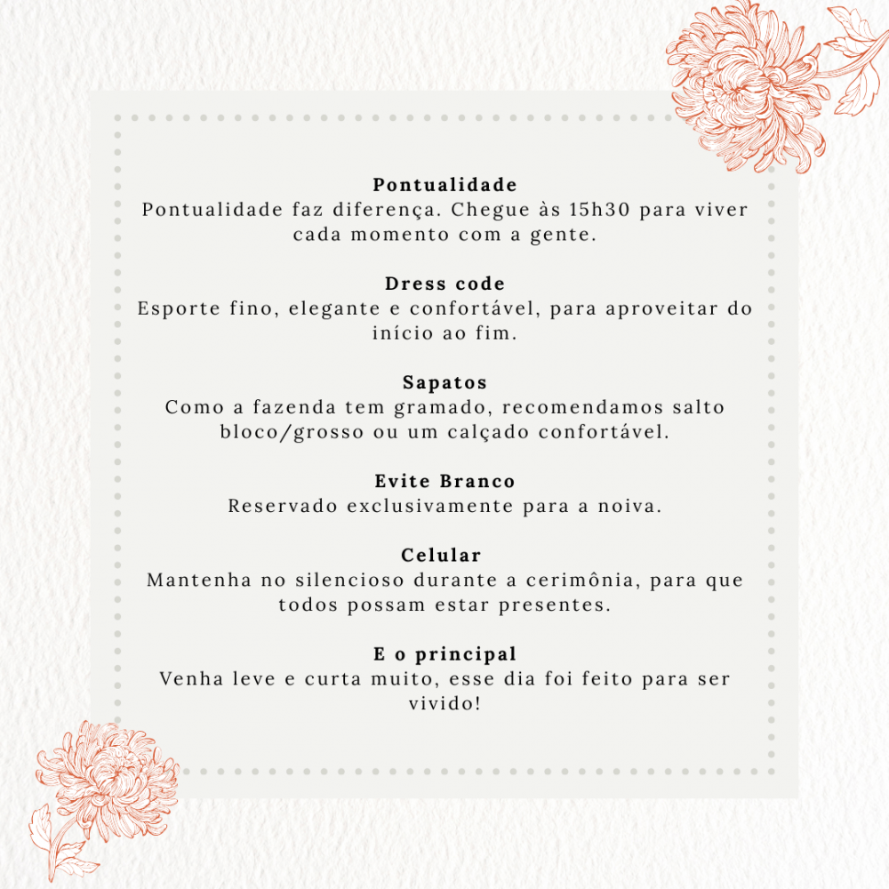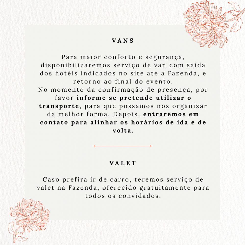 Após a confirmação de presença, nossa assessora entrará em contato para solicitar duas informações: